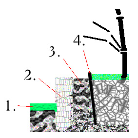 Variation - Hochbeet ![]() Bambus im Hochbeet Schema 1. Rasenniveau 2. Granit oder Sandstein (50x50x80cm Blöcke) 3. Zwischenschüttung (50 cm zw. Stein und Sperre) 4. Rhizomsperre (Durchmesser 1 x 2 Meter) ...innere Bepflanzung Die Zwischenschüttung (3.) kann problemlos bepflanzt werden Rechts: Einfassung Sandstein Alternative: Roter oder Grauer Granit |